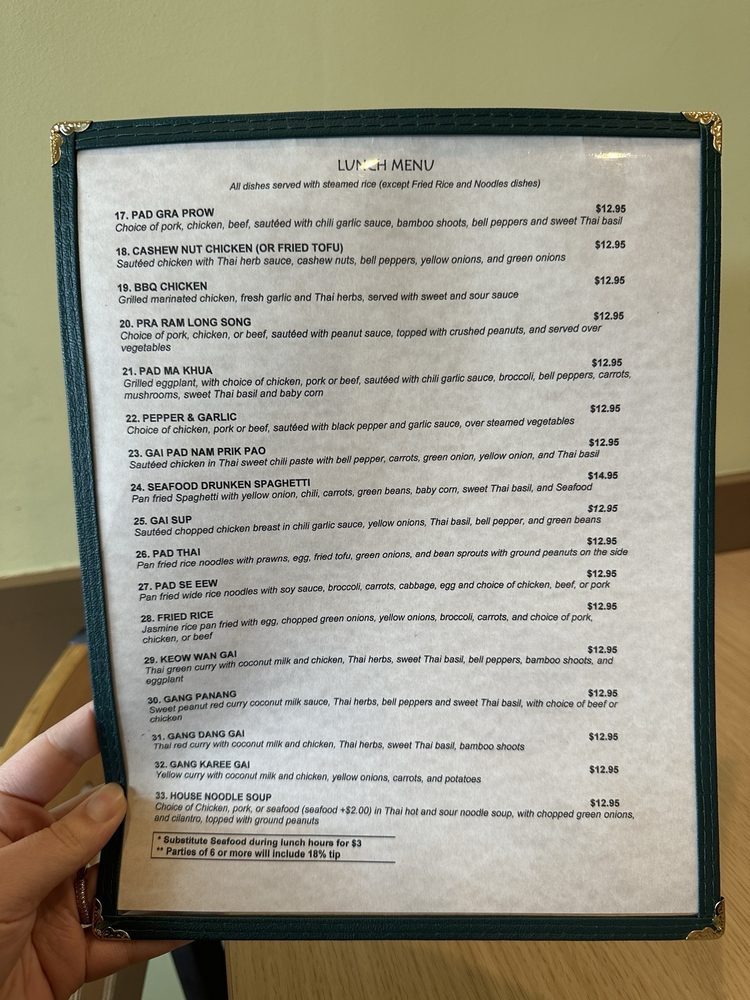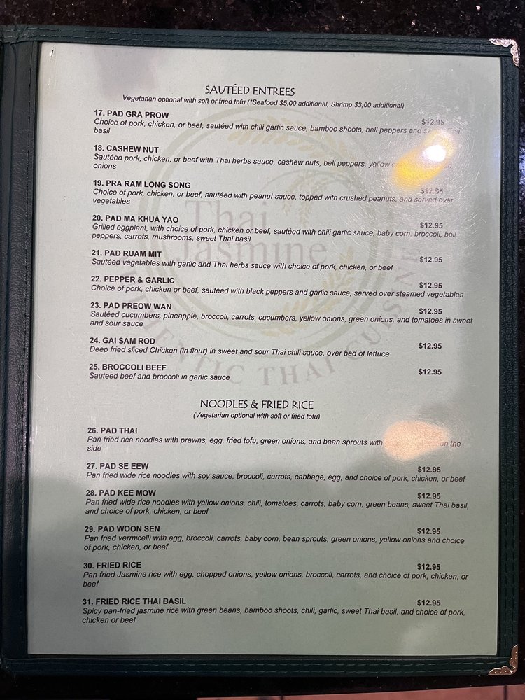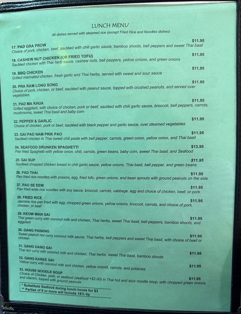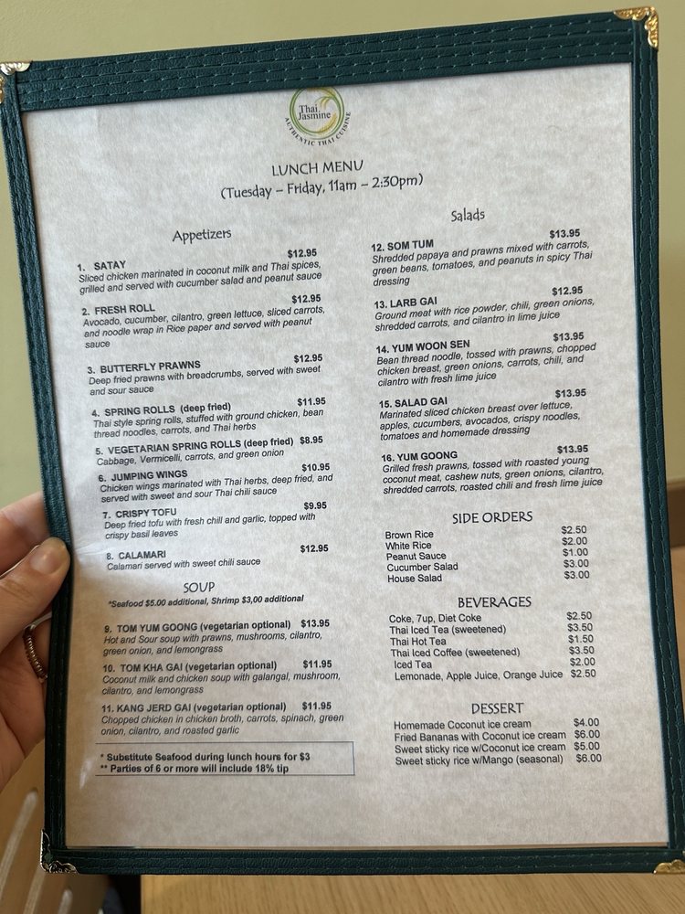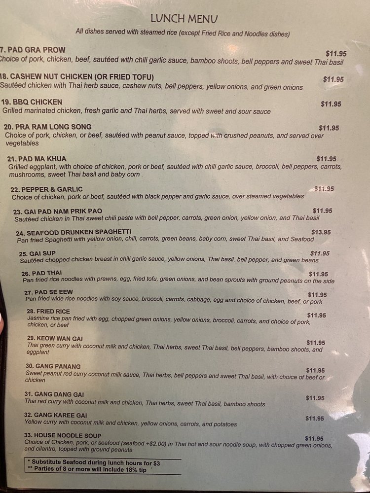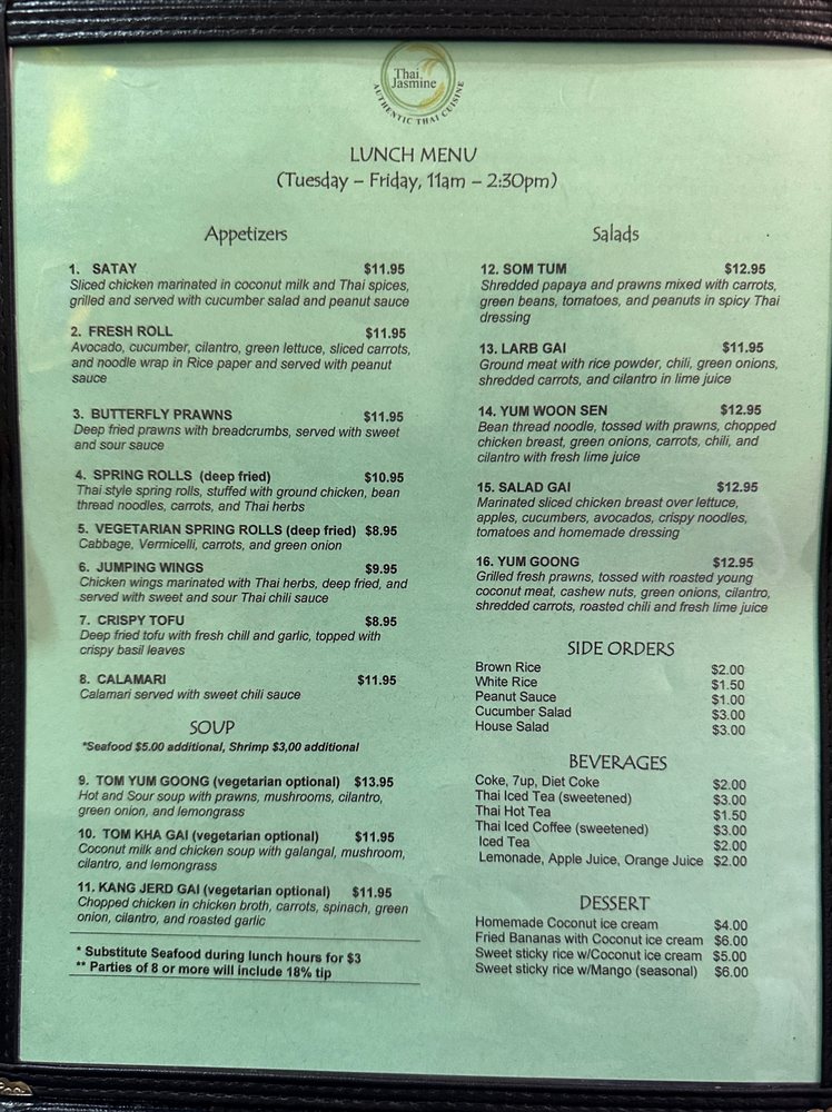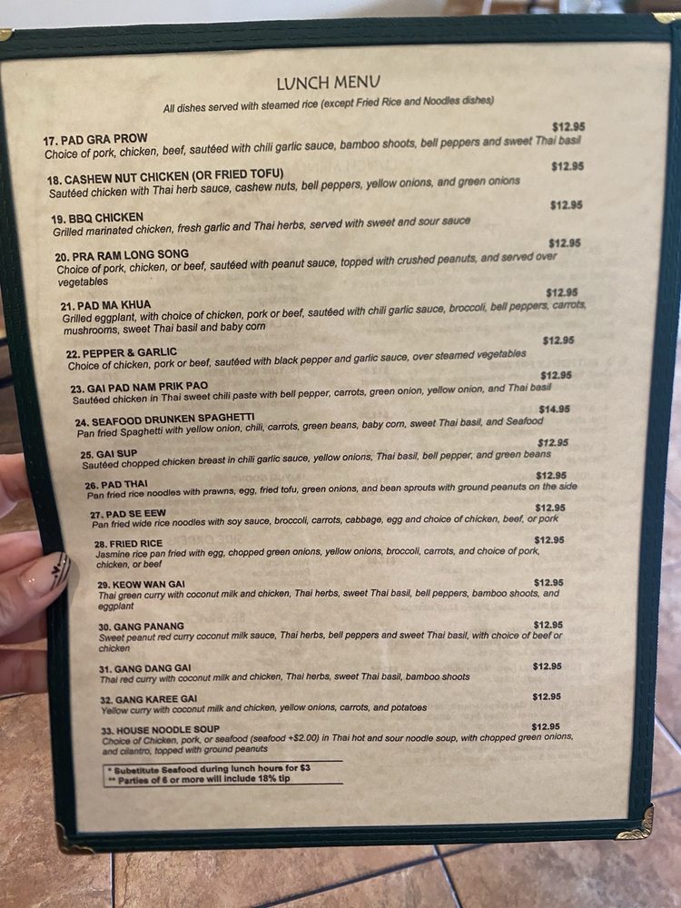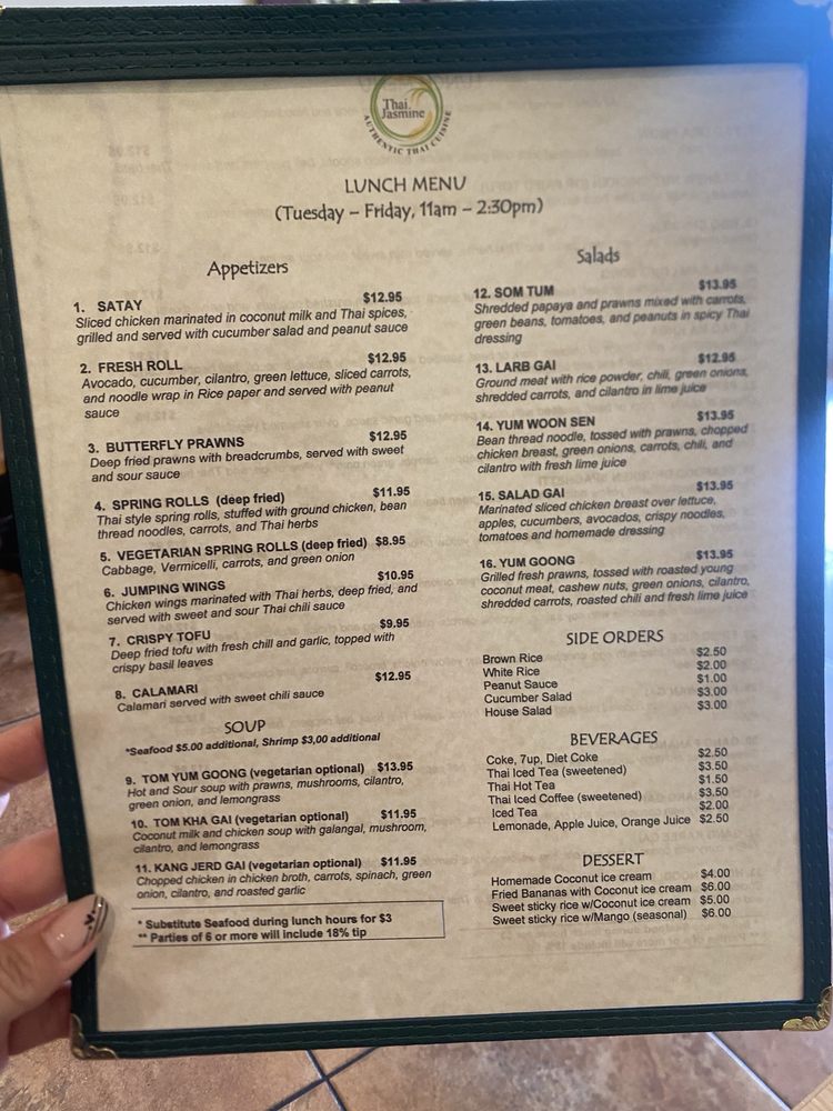 Welcome to Thai Jasmine, a delightful gem located at 29 W 10th St, Tracy, CA. Offering an authentic taste of Thailand, the menu boasts an impressive array of dishes sure to satisfy every palate. Highlights include the Seafood Drunken Spaghetti and the classic Pad Thai, both priced at a reasonable $12.95. For curry lovers, options like Gang Karee Gai and Gang Dang Gai are available at just $10.95.
